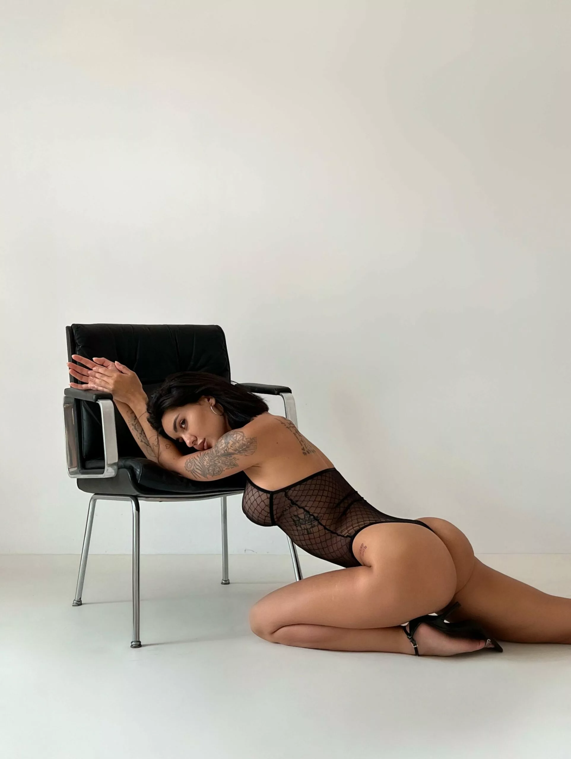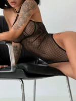 Гармонія, яка утворилась із різноманіття форм. Боді дивує неординарною сіточкою з геометричним малюнком. Великою перевагою цього красеня є зручність та надійність посадки. Верх боді у формі холтер-бра, застібка на шиї, що регулюється, разом з щільною та еластичною резинкою під грудьми забезпечать гарну посадку. Низ боді виконаний в улюбленій формі – стрінг, яка вигідно підкреслює довжину ніг та форму сідниць. Безумовного шарму придають відкриті плечі, які є елементом витонченої спокусливості.