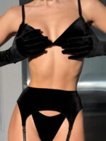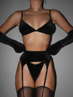 Безкаркасний бюстгальтер в насиченому чорному кольорі зроблений із італійського еластичного велюру. Бретелі регулюються по висоті і також бра регулююється по обхвату застібкою на спинці в три ряди.
