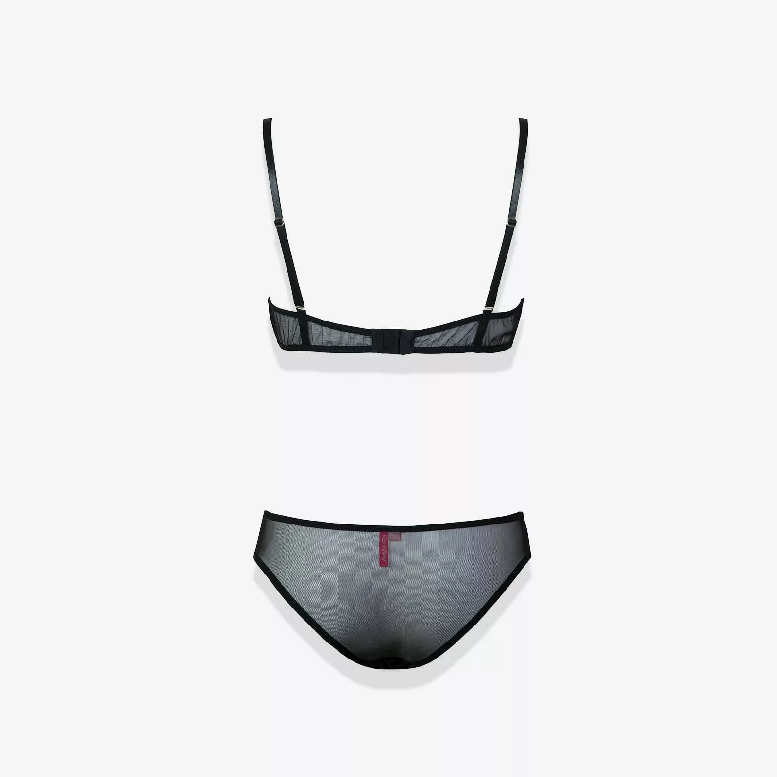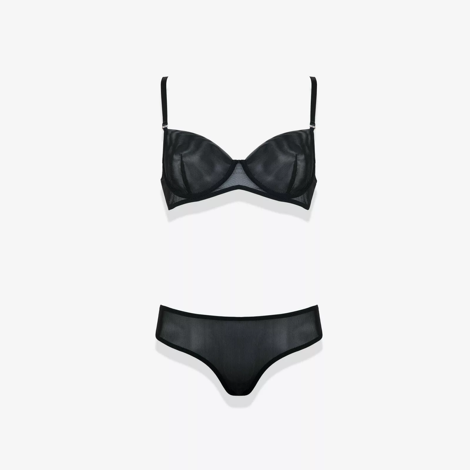Класичний базовий комплект із еластичної чорної сіточки – ідеальний варіант у будь-якій ситуації. Чорний бюстгальтер із гладкої м’якої сіточки в два шари, на кісточках. Зручний та гарно підтримує бюст. Чорні трусики – сліпи із гладкої м’якої сіточки – напівпрозорі, комфортні, підкреслюють форму сідниць.