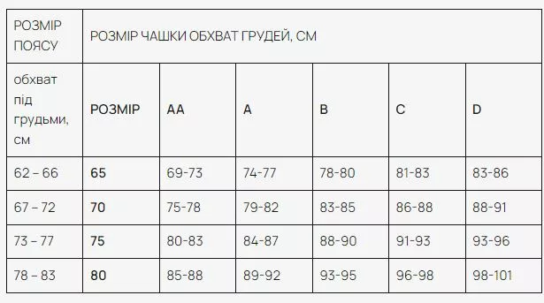 РОЗМІР ПОЯСУРОЗМІР ЧАШКИ ОБХВАТ ГРУДЕЙ, СМ