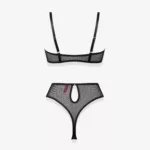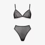 Активний образ життя змушує по-справжньому цінувати зручність та практичність нижньої білизни. Комплект виконаний з тендітної, приємної до тіла сіточки усипаної дрібним візерунком насправді заслуговує уваги. Топ з м’якими чашечками та без кісточок – це комфортний варіант на кожний день. Бретелі регулюються по висоті. Трусики-стрінги мають посадку на талії, тому оздоблені вирізом у вигляді крапельки та оснащені застібкою-крючком ззаду. Така форма трусиків підкреслить форму сідниць та візуально видовжить ніжки. Ластовиця – 100% бавовна.