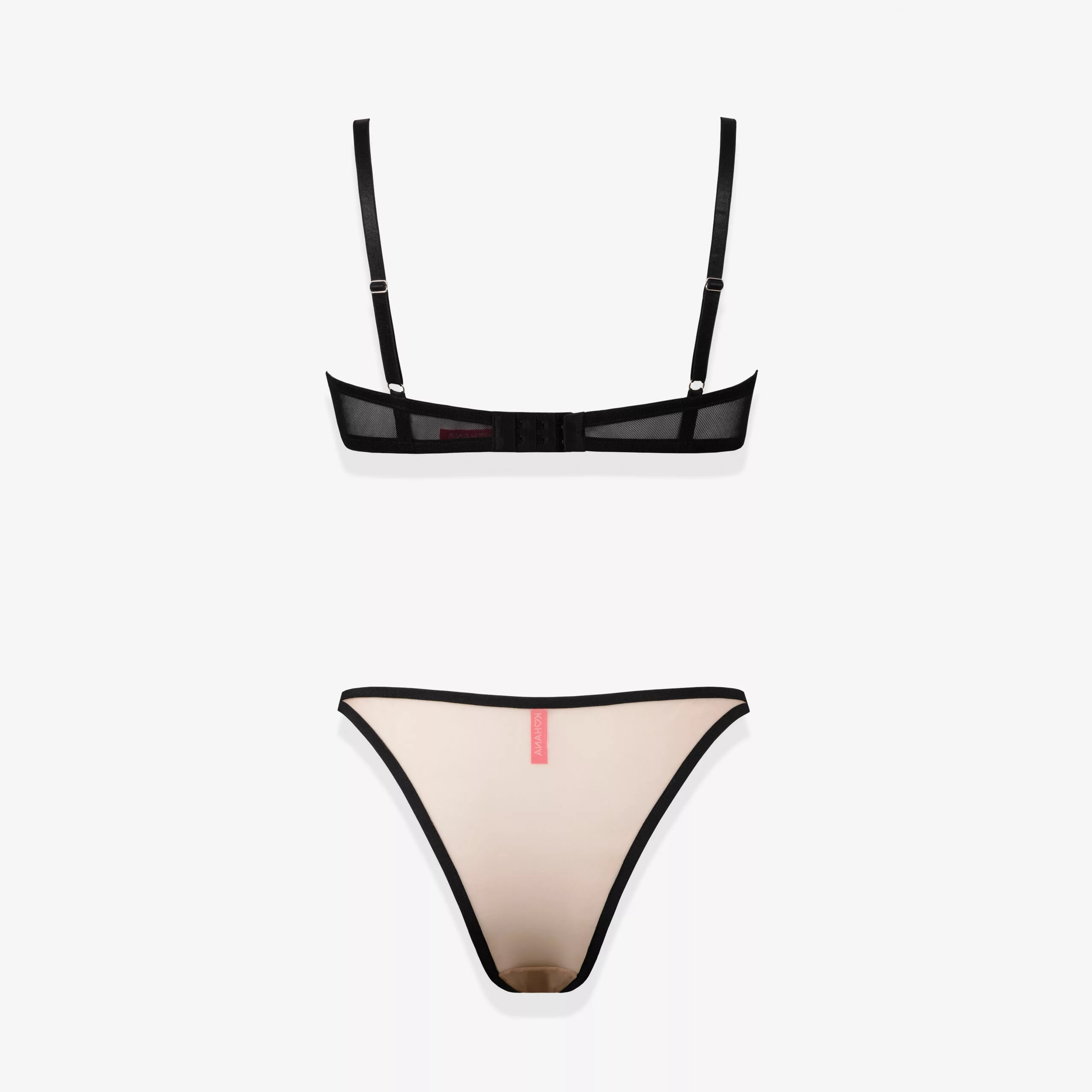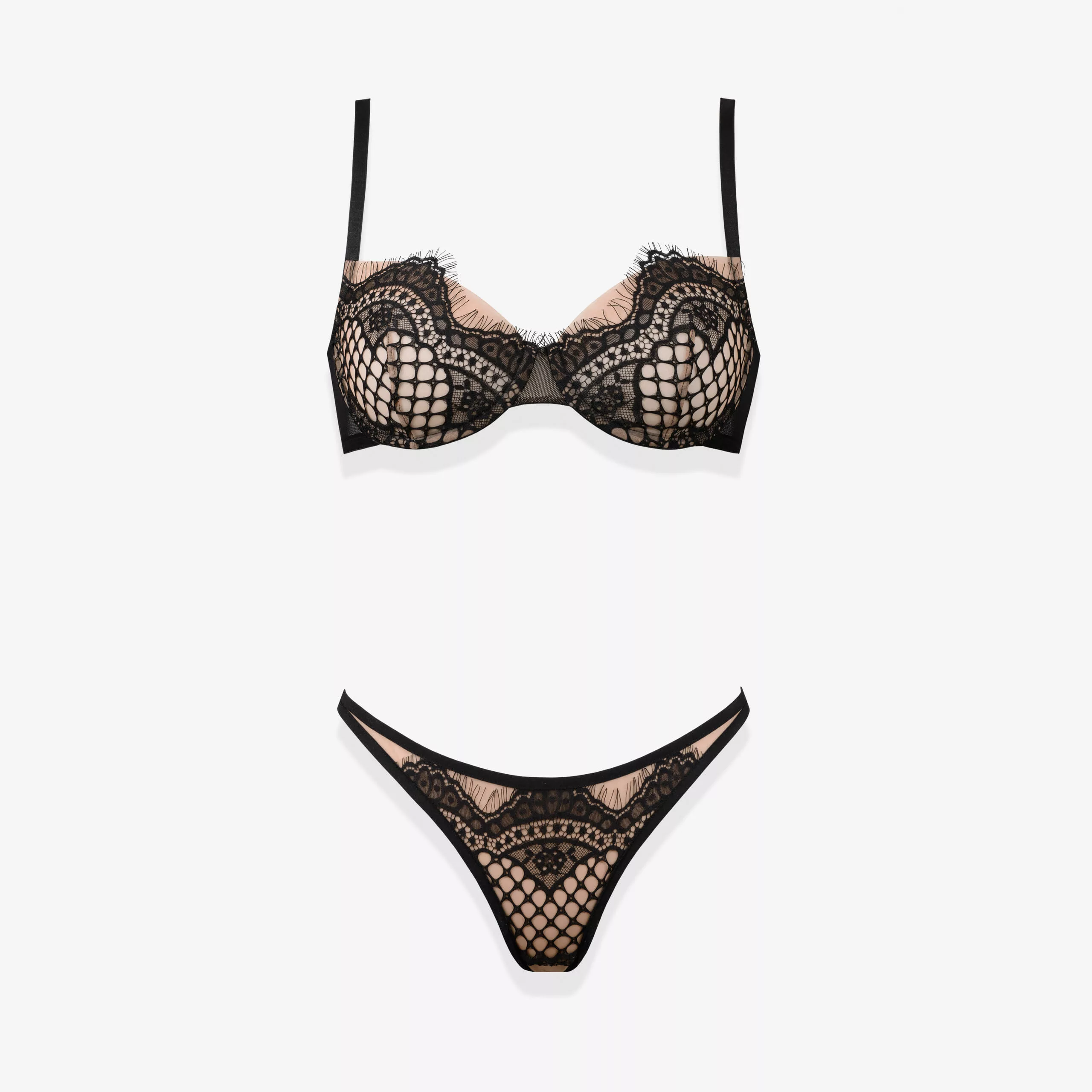 Чарівливе і таке улюблене поєднання бежевого та чорного кольорів, комбінація невагомої сіточки та фактурного мережива – це те, що прекрасно виглядає на жіночому тілі. Бюстгальтер на металевих кісточках, додатково оснащений пластиковими корсетними кісточками по боках, що забезпечує кращу підтримку та посадку. Мереживні чашки цього бра продубльовані зсередини м’якою бежевою сіточкою, що приємно відчувається на тілі. Бретелі регулюються по висоті. Трусики, що мають середню посадку, виготовлені з тендітної бежевої сіточки та декоровані яскравим елементом з мережива спереду. Ластовиця – 100% бавовна.