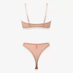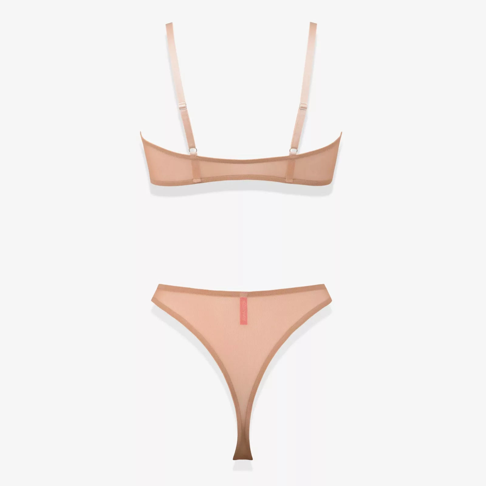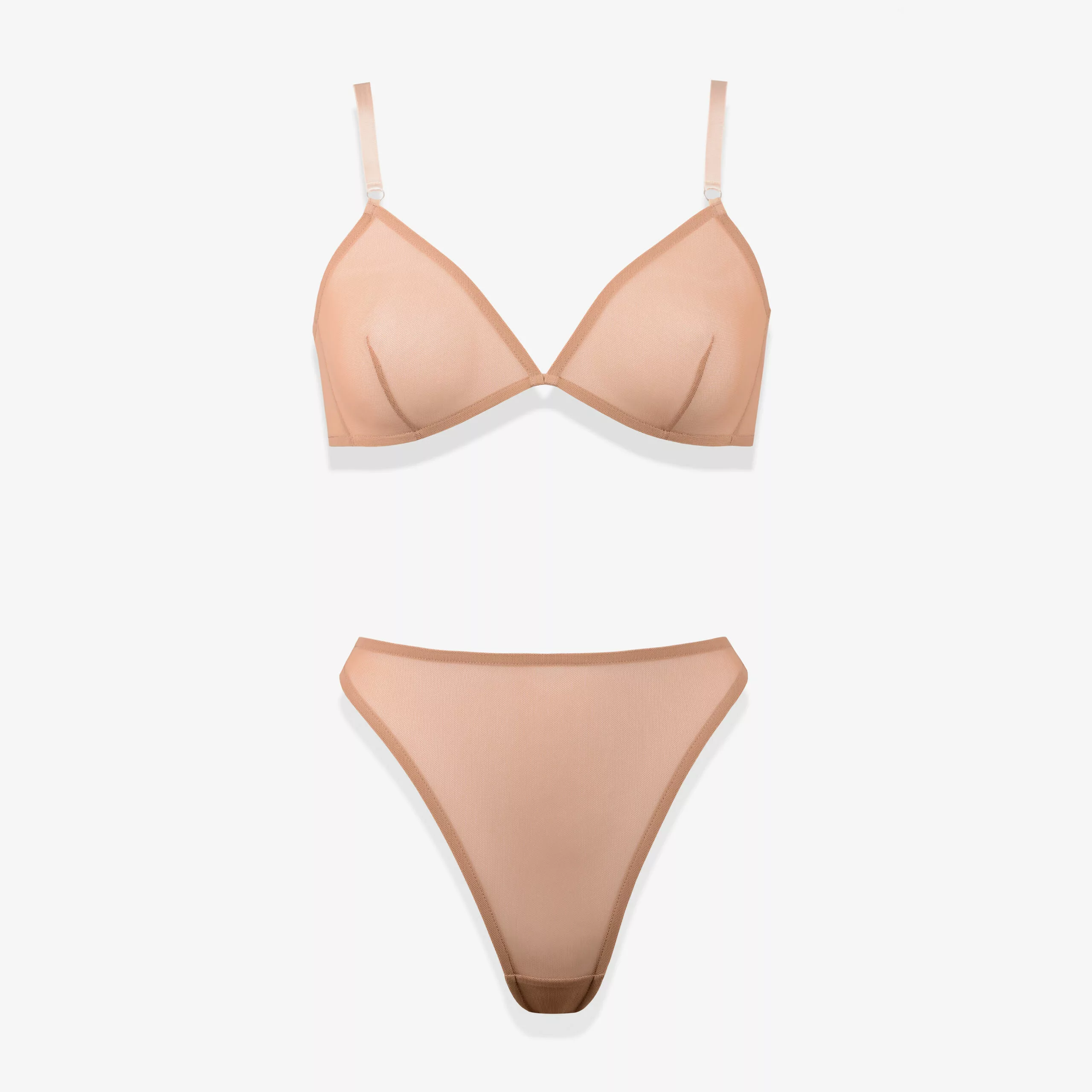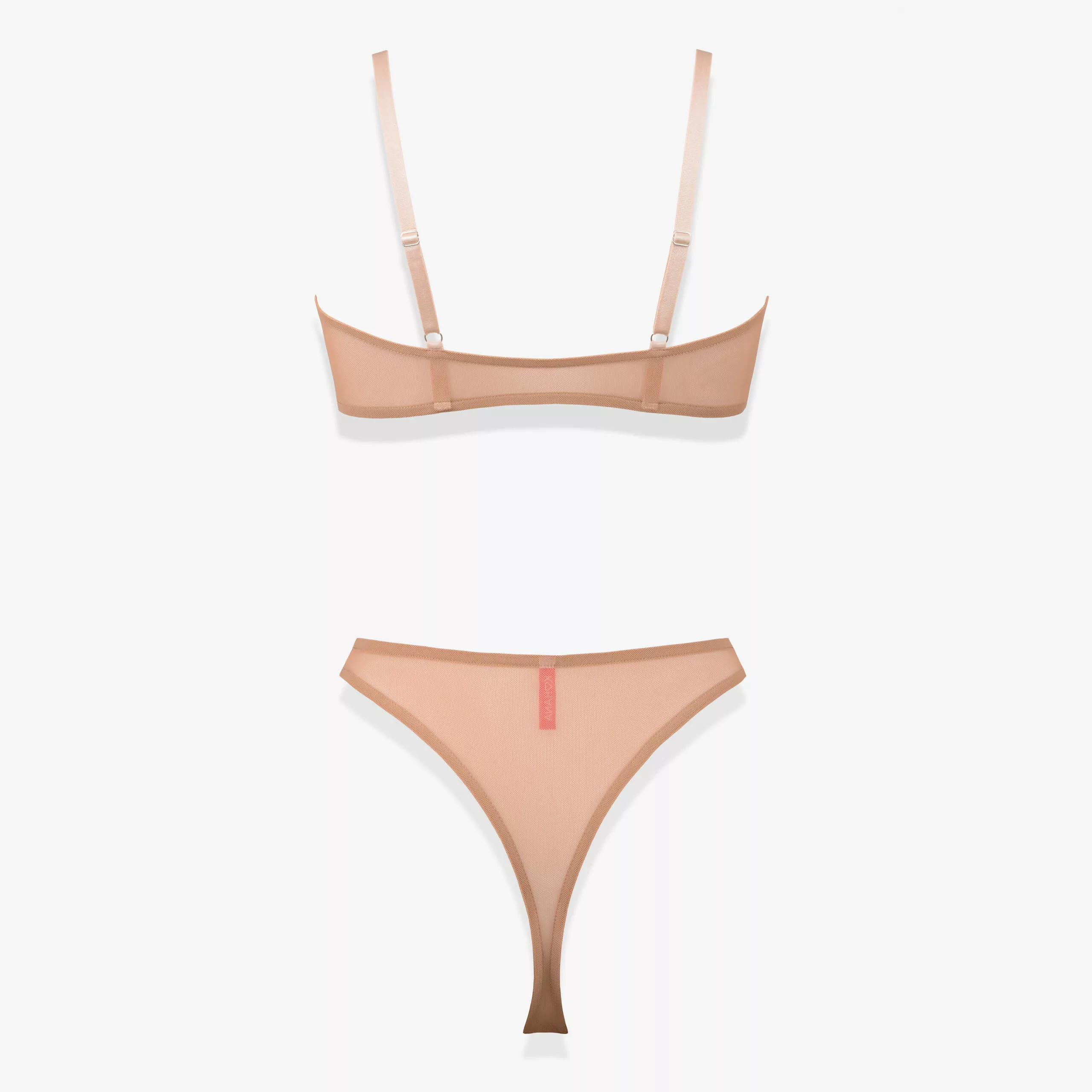 Як же важливо мати надійного компаньйона на всі випадки життя у вигляді базової нижньої білизни бежевого кольору. Лаконічний дизайн та відтінок засмаги поєднані в цьому Second Skin Set. Комплект виконаний з надм’якої та невагомої сіточки. Топ без кісточок, з бретелями, що регулюються – справжнє втілення комфорту. Трусики-стрінги мають завищену лінію ноги та середню посадку, що візуально видовжує силует. Ластовиця – 100% бавовняний матеріал. Доповнюйте свій образ халатиком та панчохами на ваш вибір. Склад: 79% поліамід, 11% еластан, 10% бавовна.