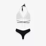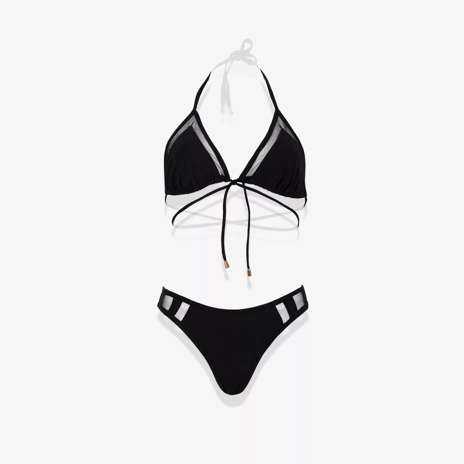 Привабливий купальник-бікіні з тропічним настроєм. Створені особливі лінії в цьому купальнику візуально підкреслять достоїнства вашої фігури. Топ виконаний із італійського біфлексу з вставками із прозорої сіточки по краям чашечок, на підкладці. Трусики у формі бразиліана, спереду також зі вставками із сіточки. Купальник оздоблений мідними наконечниками на зав’язках.