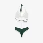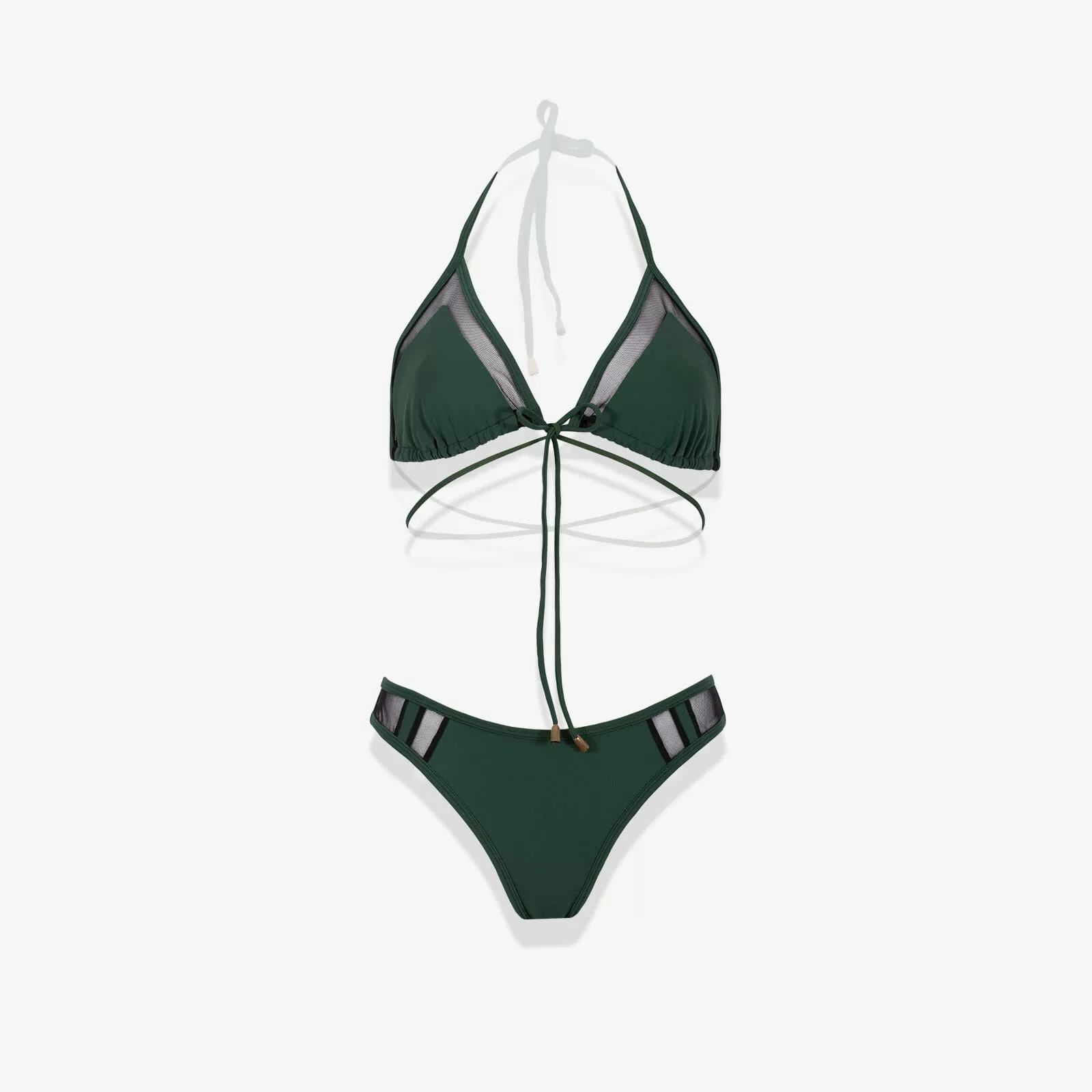 Привабливий купальник-бікіні з тропічним настроєм. Створені особливі лінії в цьому купальнику візуально підкреслять достоїнства вашої фігури. Топ виконаний із італійського біфлексу з вставками із прозорої сіточки по краям чашечок, на підкладці. Трусики у формі бразиліана, спереду також зі вставками із сіточки. Купальник оздоблений мідними наконечниками на зав’язках.