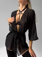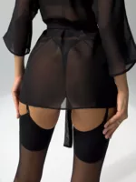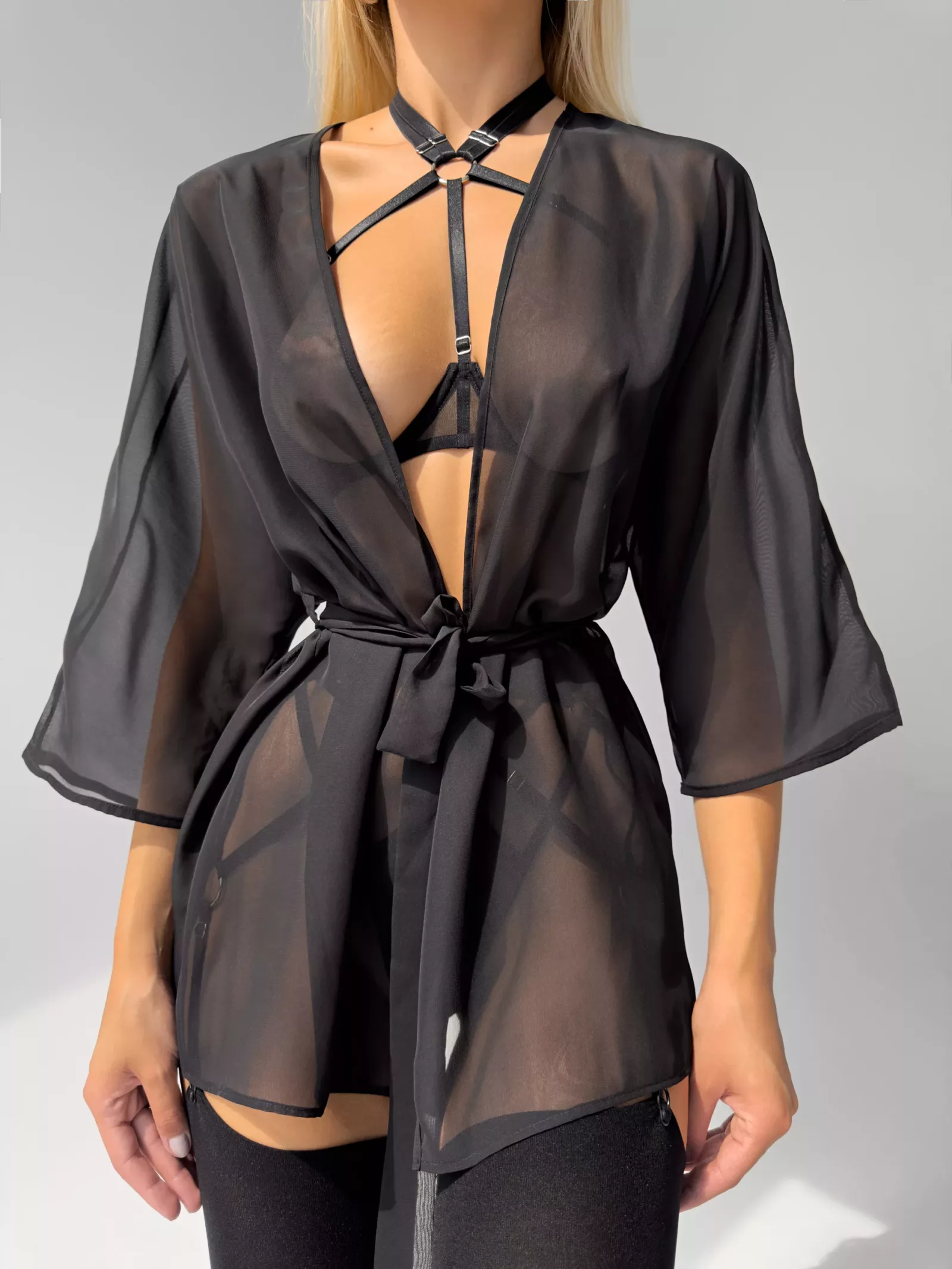 Халатик натхненний енергетикою вишуканої звабливості. Виготовлений з чорного шифону, який не заважає тілу дихати, а також не є вибагливим у догляді, витримуючи делікатне машинне прання. Силует халату підкреслює жіночність, а вільні рукава додають граційності кожному руху. Халатик фіксується поясом на талії.