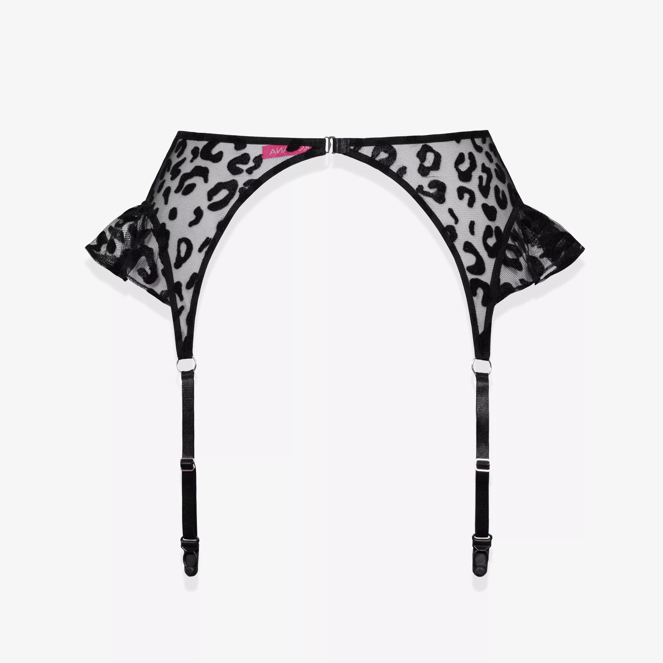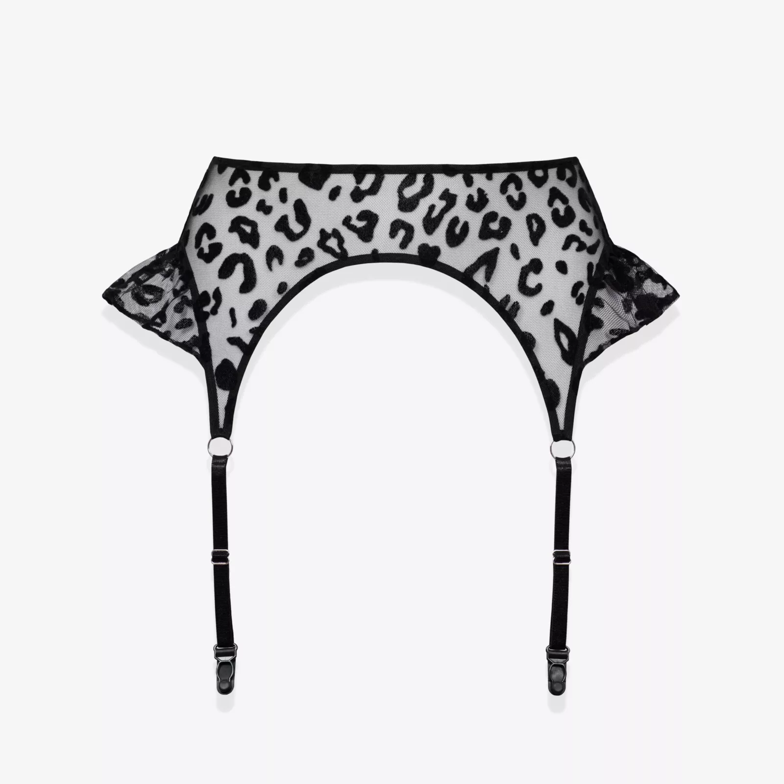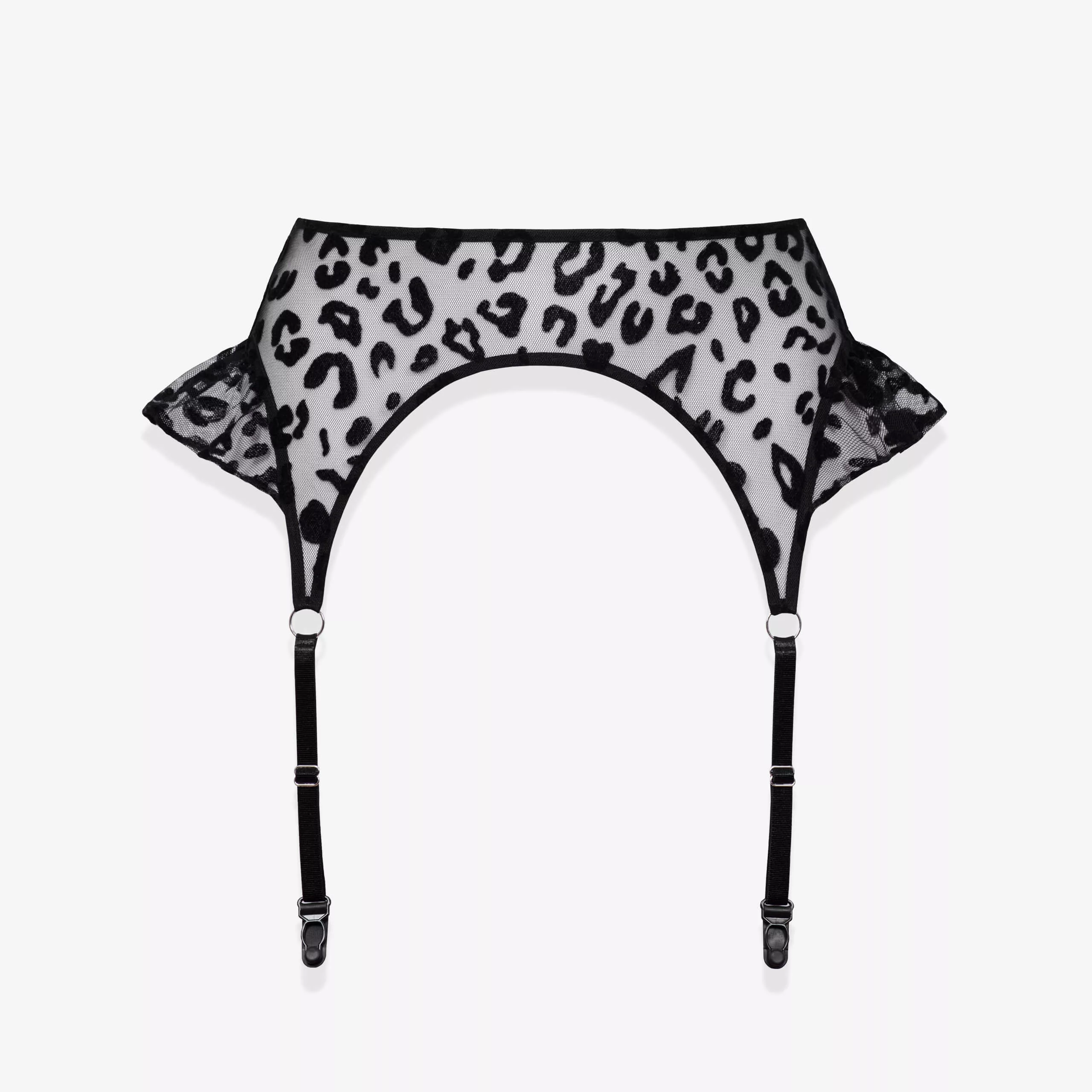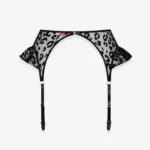 Заманливий Black Magnetism із напівпрозорої тонкої сіточки, вкритої оксамитовим напиленням із леопардовим принтом, приховує у собі істинні інстинкти. Комплект ніжно сидить на тілі, створюючи привабливі силуети. Грайливий пояс із еластичної сіточки з леопардовим малюнком, такий кокетливий та спокусливий за рахунок рюш, нікого не залишить байдужим. Панчохи з поясом – спокусливий елемент у будь якому жіночому гардеробі.