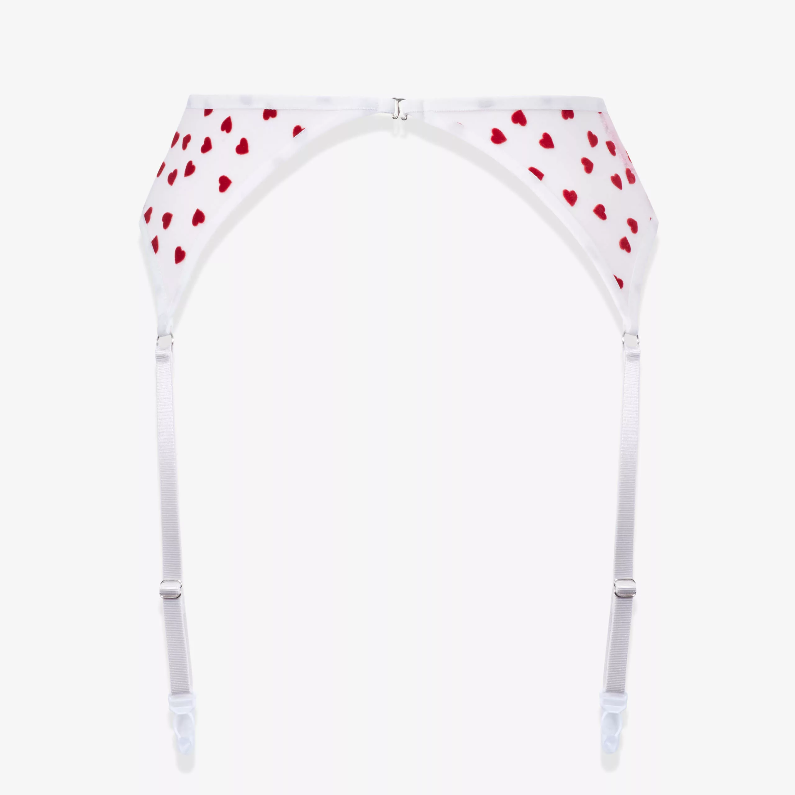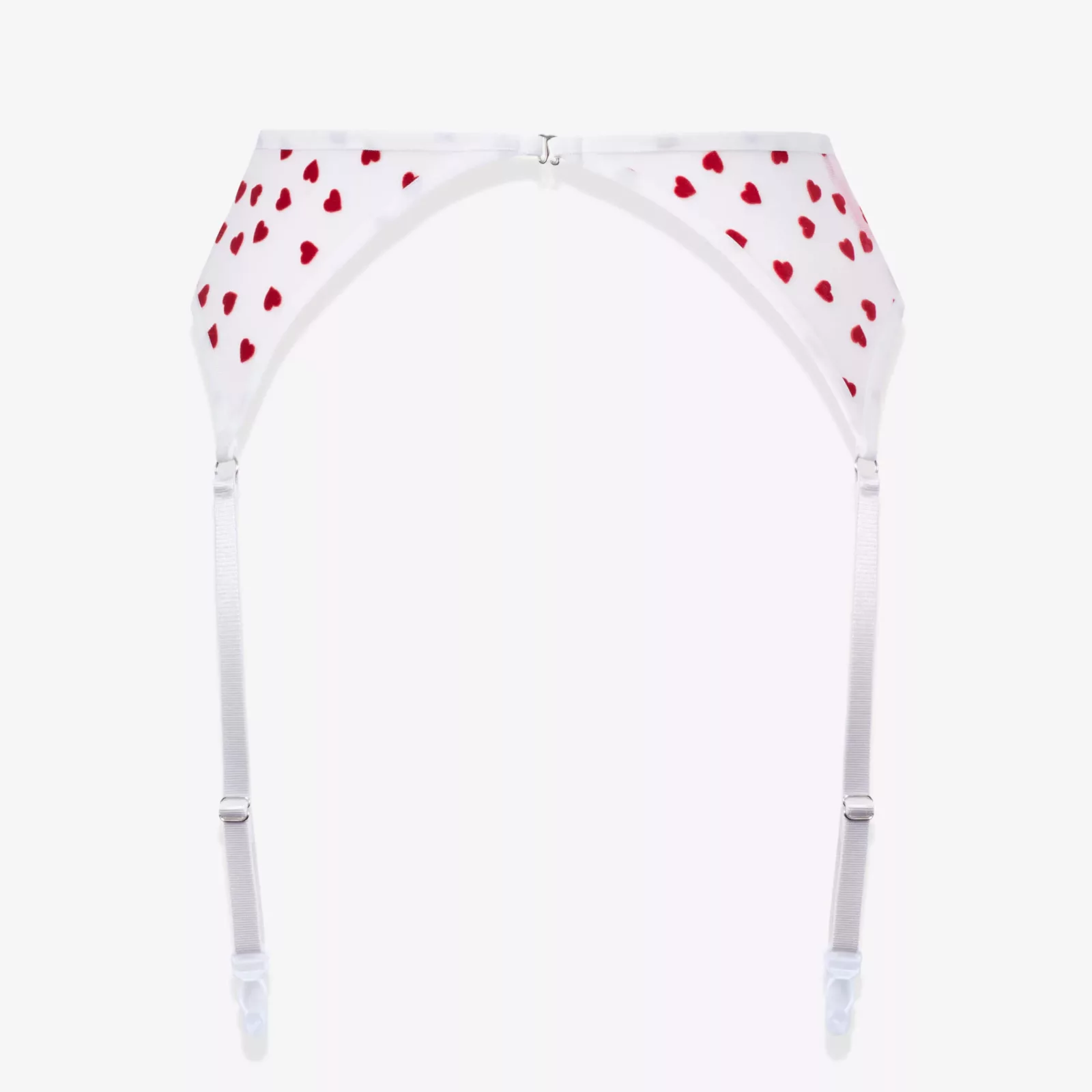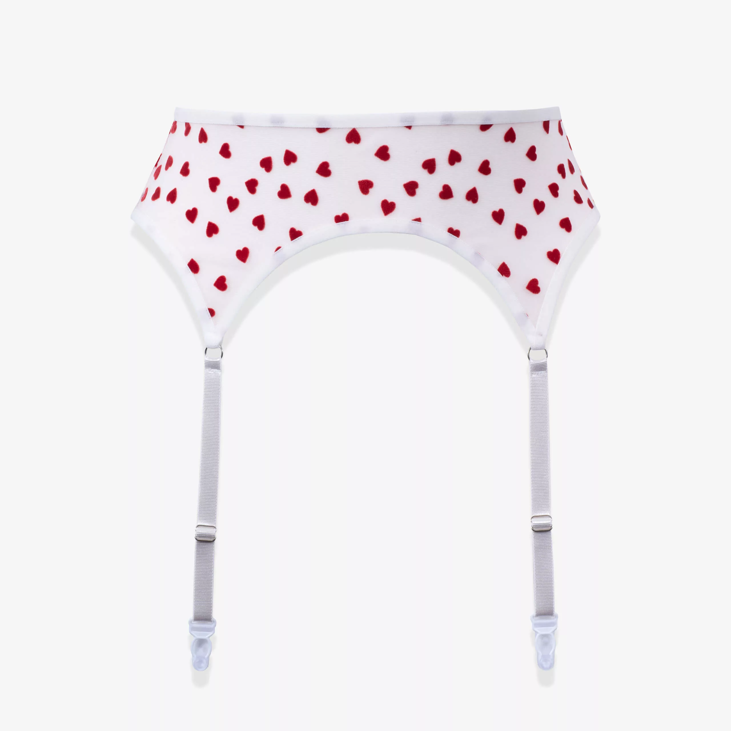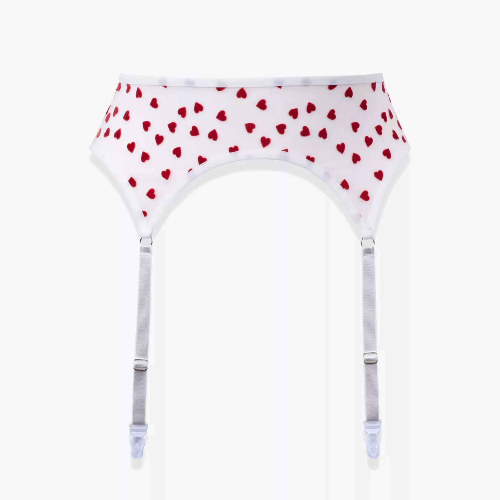 Цей солодкий сексуальний комплект із сіточки молочного кольору, усипаний червоними оксамитовими сердечками. Пояс для панчіх підкреслює та формує талію. Панчохи з поясом – спокусливий елемент у будь якому жіночому гардеробі.